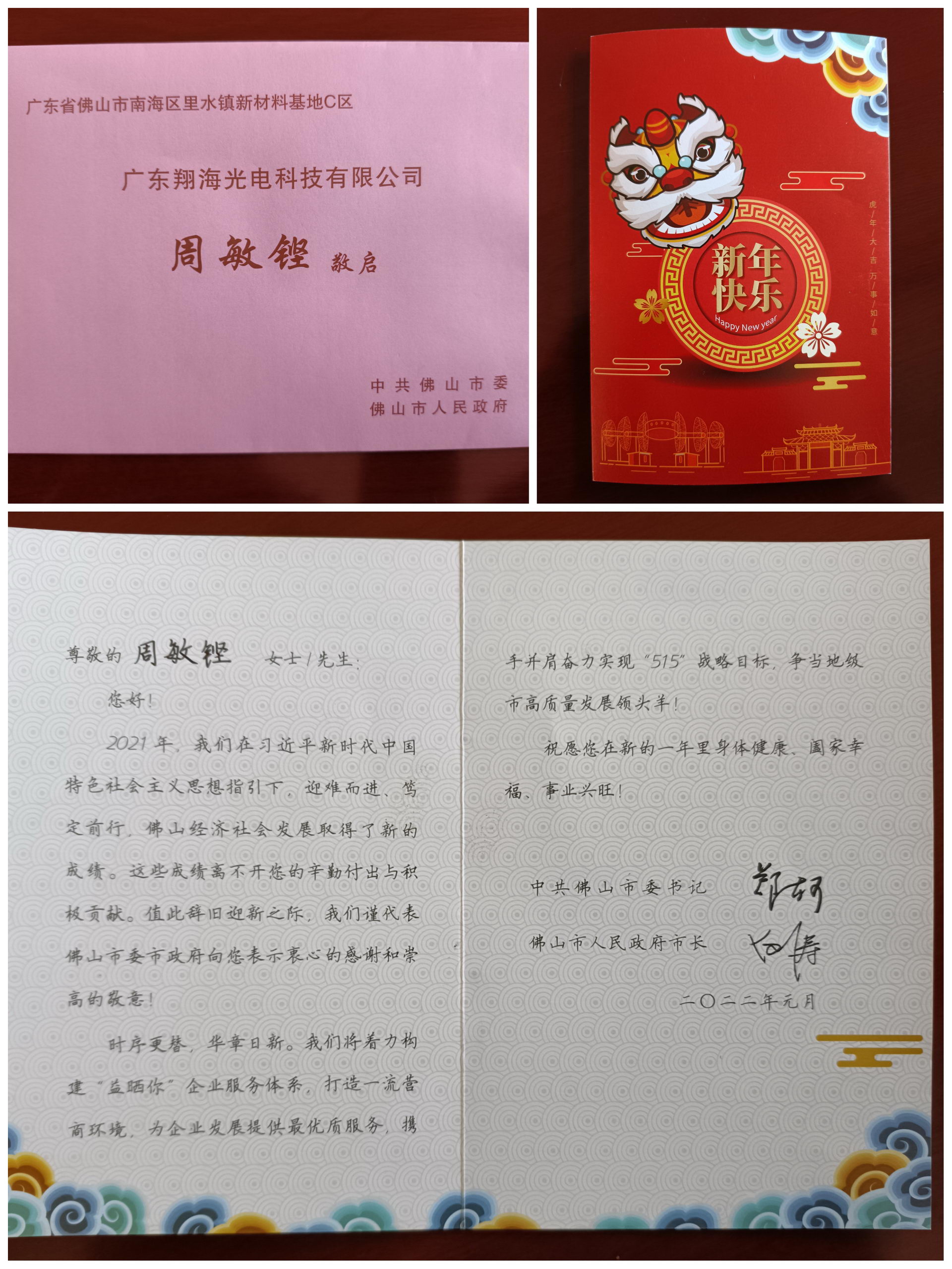 值此辞旧迎新之际,广东西甲在线买球(中国)有限公司官网西甲在线买球(中国)有限公司官网有限公司收到了来自佛山市委、市政府的新年贺卡,深切感受到了党和政府对企业的关心与祝福,倍感温暖、备受鼓舞。